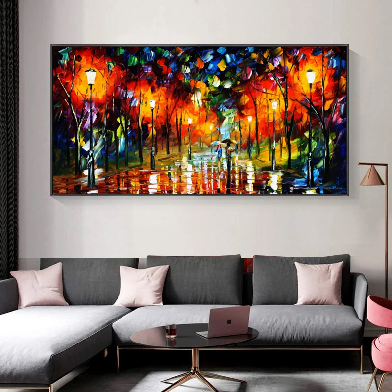 Addition Information of Landscape Poster Colorful Oil Painting Lover in The Rainy Light Road Canvas Painting Wall Pictures
